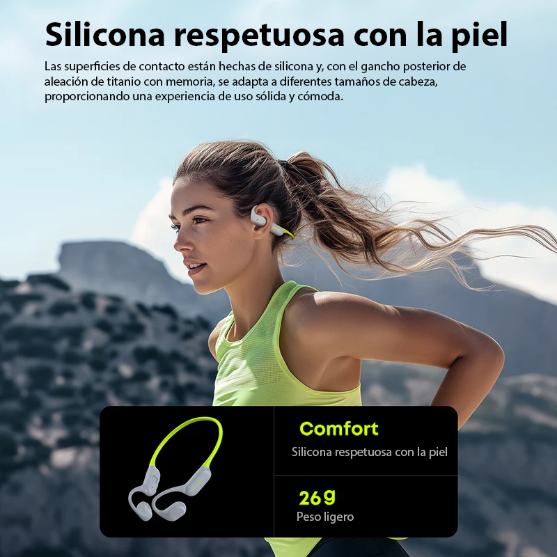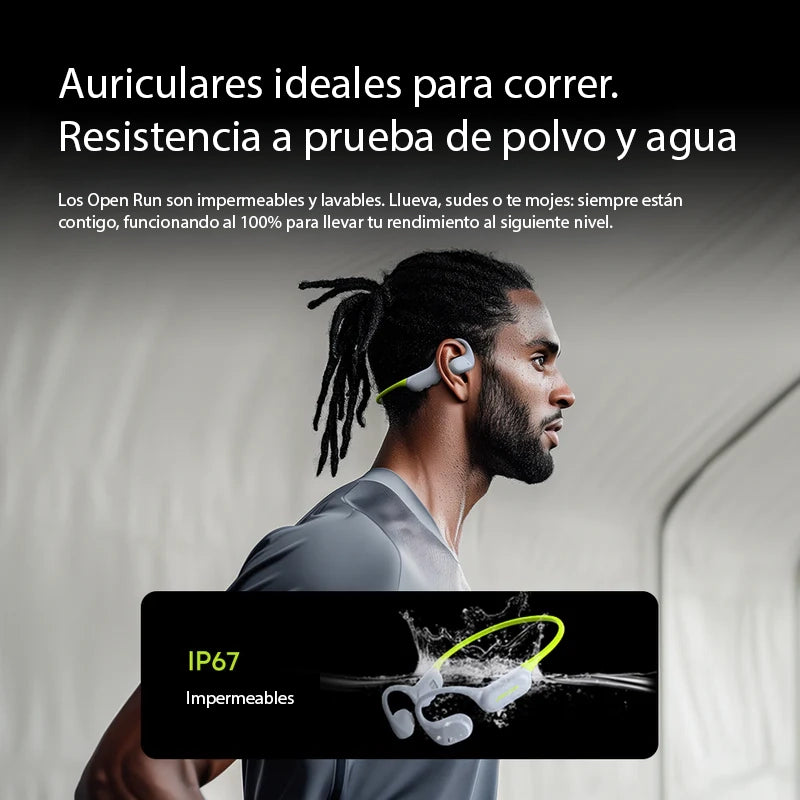 Fabricados en material ABS ultraligero, su diseño open-ear garantiza comodidad durante largas horas de uso. Su sujeción es firme y estable, incluso en sesiones de alta intensidad. Además, al no bloquear los oídos, ofrecen mayor seguridad en ambientes urbanos.